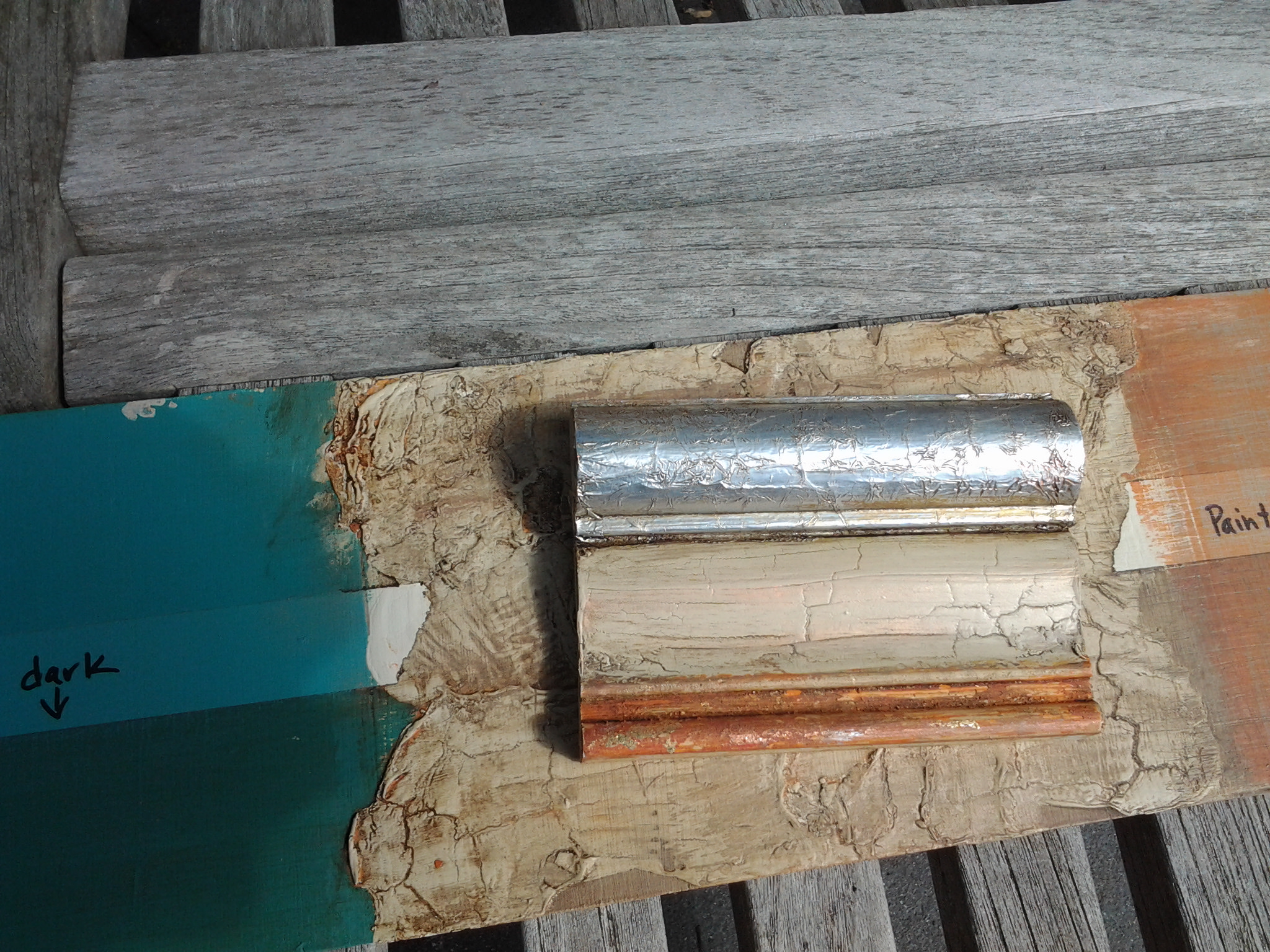 3- Foil sheets are sold a craft stores and can be unruly to use. My sample photo does not show the foil areas very well. First apply paint color(s). Apply Wunda Size to area for gilding. Dry size to tacking touch. Apply gild sheet [I used a couple small 1″ pieces]. Burnish with a brush. Sample has dark wax finish.