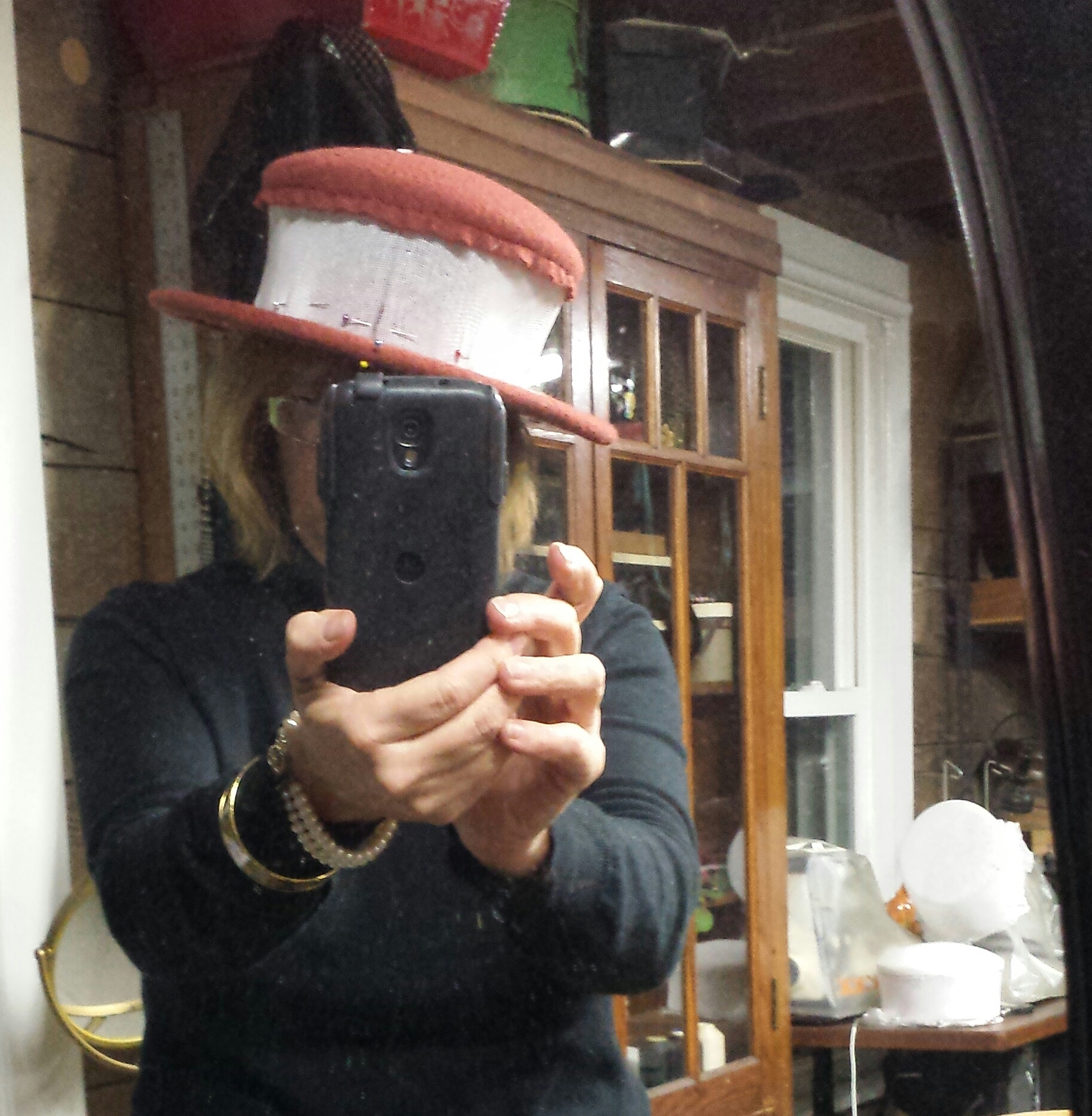 I also clipped and manipulated the hole to fit my head. Once we had a good fit the brim and crown were pinned together and a running stitch was placed in each tab to secure.