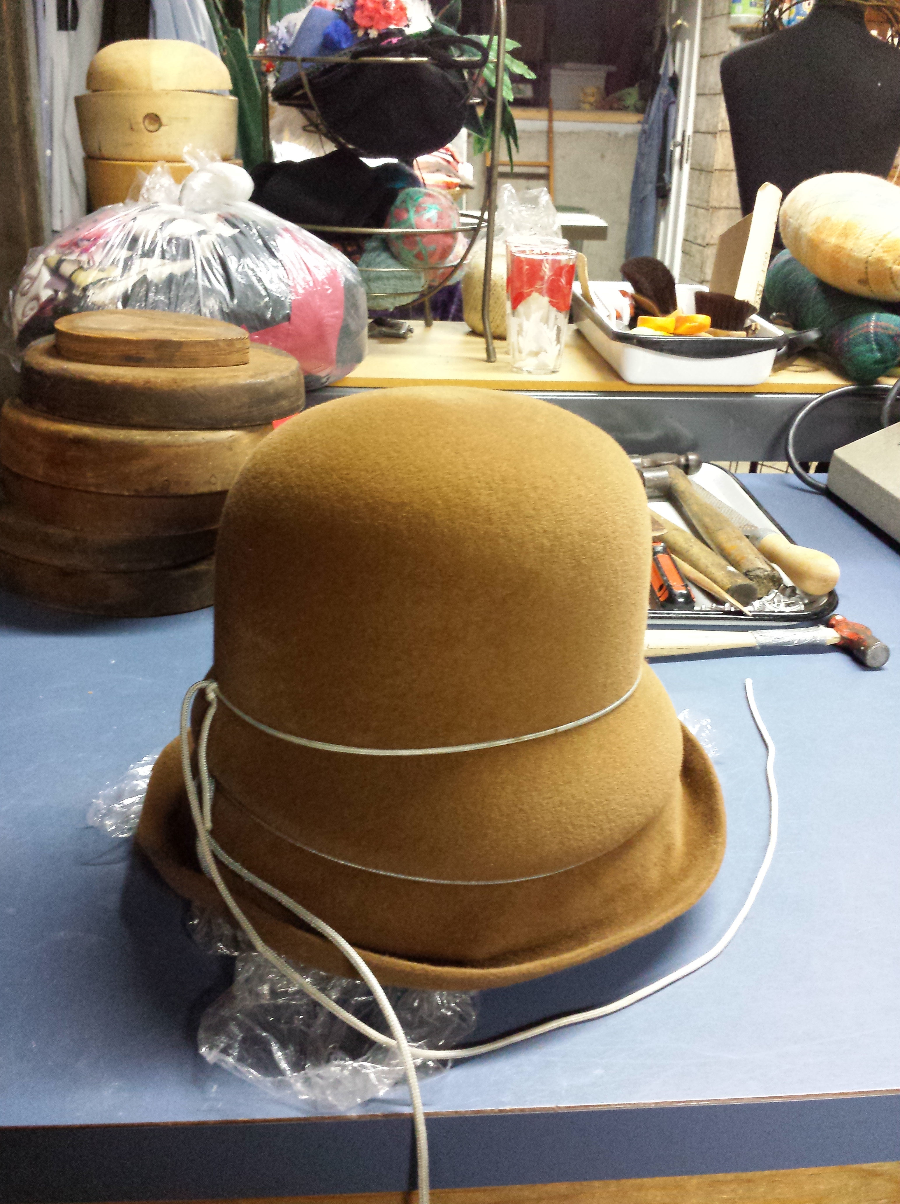 The felt base is sprayed with water on the inside and steamed until fully moistened. Then the hat is placed in a plastic bag for 15 minutes to soften. When removed from the bag the base is hand stretched over the form and shaped using tacks and cords. When the hat is dry it is removed from the form and trimmed.