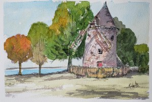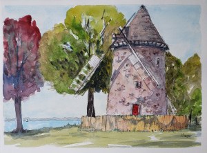 The mill lost a wing in a recent wind storm, but it remains a charming site with some good challenges for watercolor sketching.