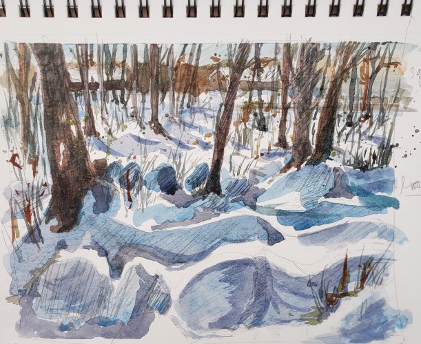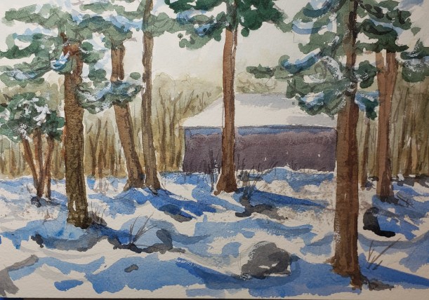 There was a forecast of snow for this week so I made the best of it by learning a few snow painting techniques in watercolor.
