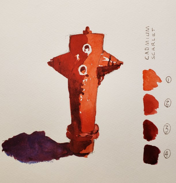 Cadmium Scarlet is a warm red, meaning it leans toward orange. Cadmium colors are opaque and that makes this color excellent for demonstrating how to create a strong ‘shadow in bright sun’ .