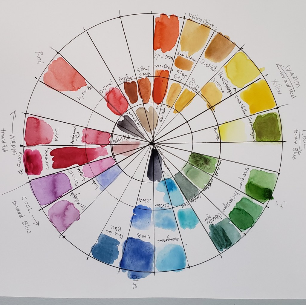 A watercolor color wheel is an important 1st step towards understanding mixing. I would encourage everyone to make their own version not only for the sheer pleasure of it but also because they are very useful guides to color mixing. (… and by using the colors on your palette it will make color mixing intuitive as you paint.)