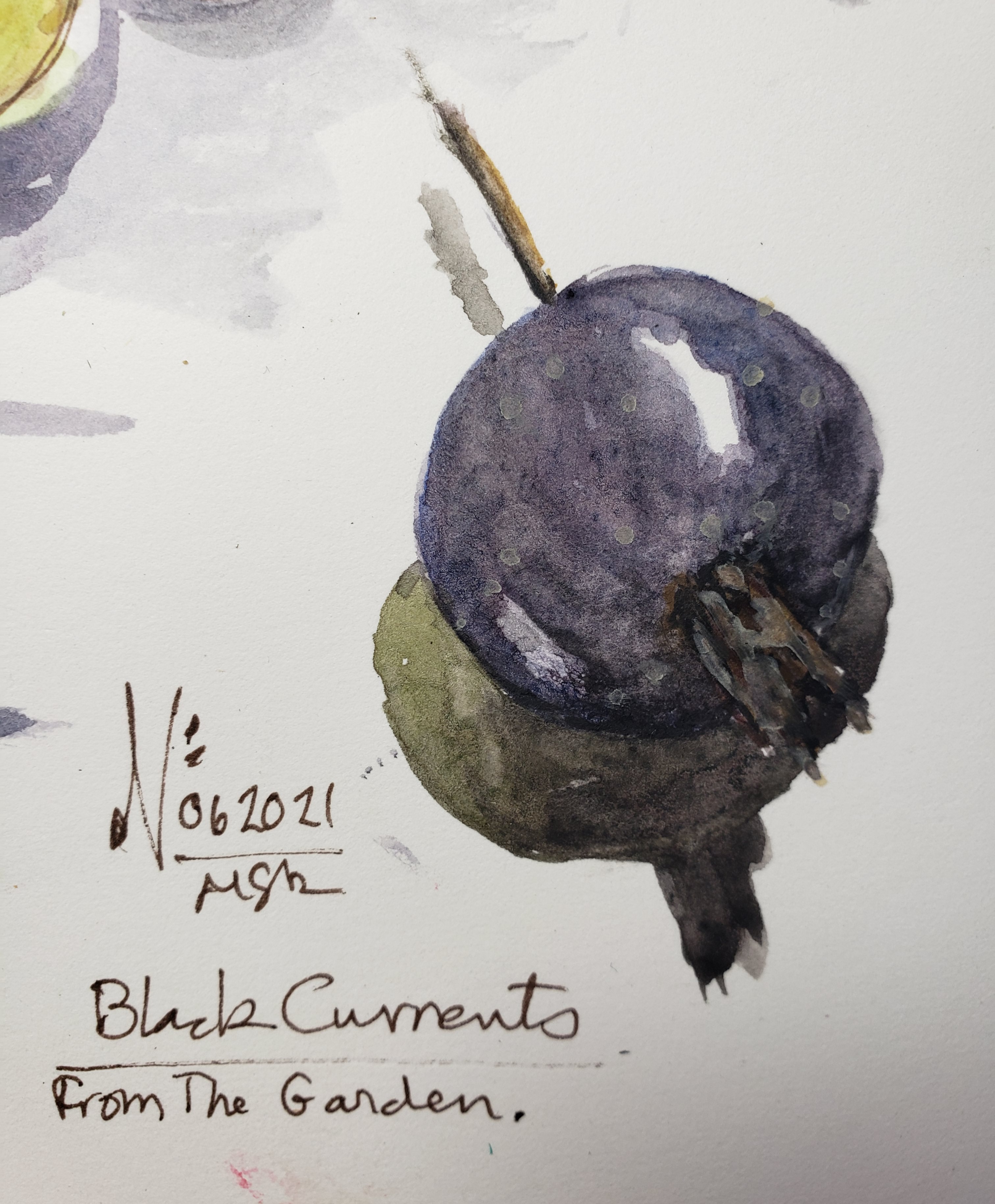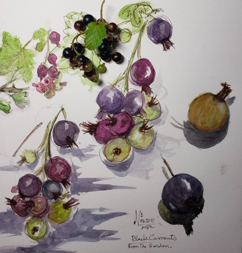 Last year I planted a black currant, ribes nigrum, this week black currant is our focus – Color Week 24. My primary objective for planting a black currant was to harvest the berries to make my own Cassis for cocktail making. I like to delve into the history and uses of each plant I grow and in this case Amy Stewart and her book The Drunken Botanist have been most helpful. Her book is fascinating, I recommend if you are curious as to the plants used to make great cocktails. Historically here are a few curious notes about the black currant