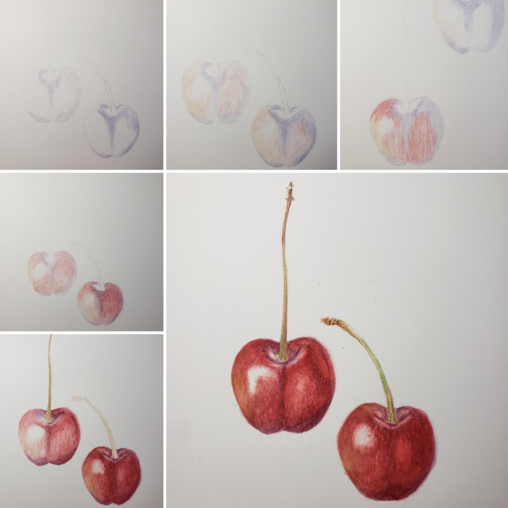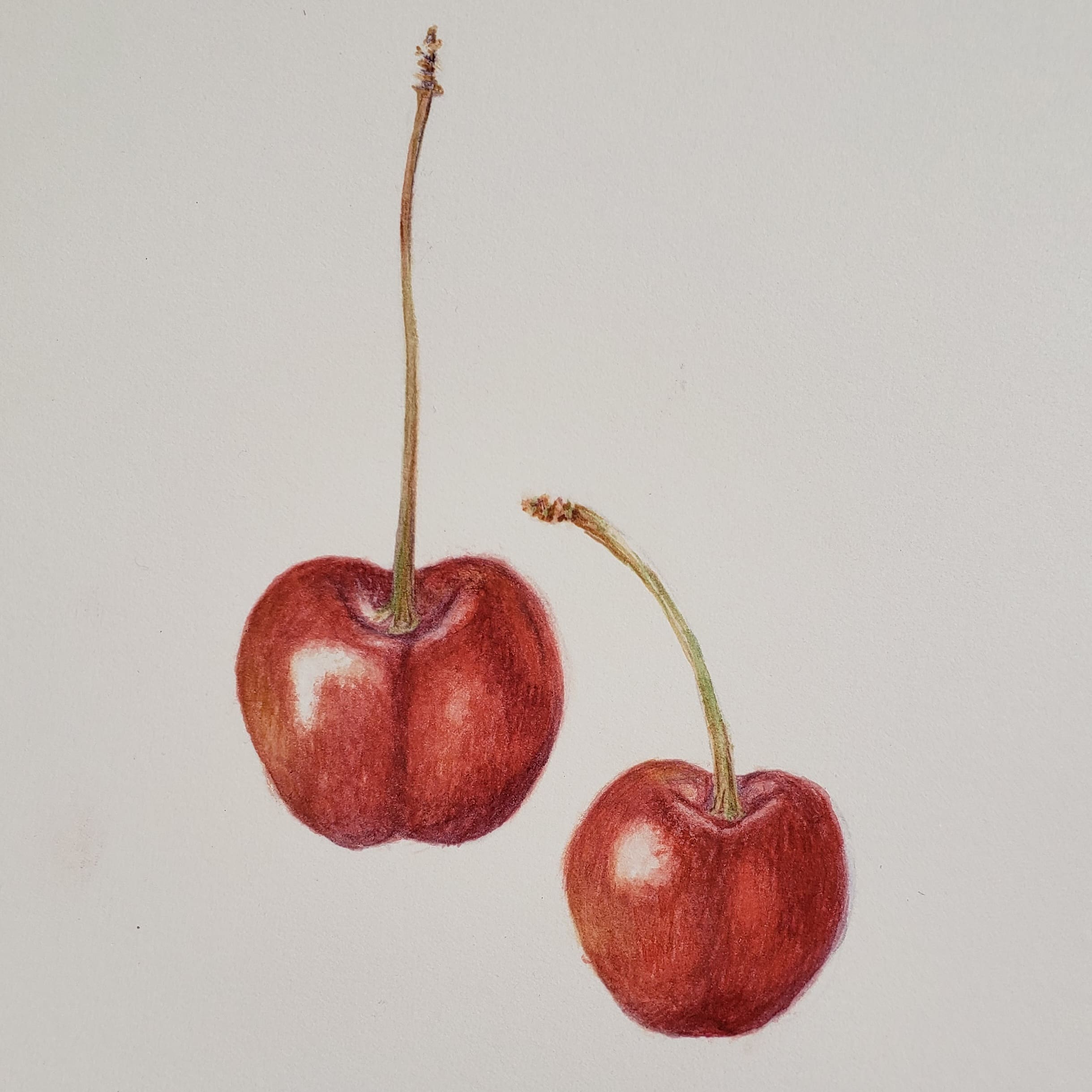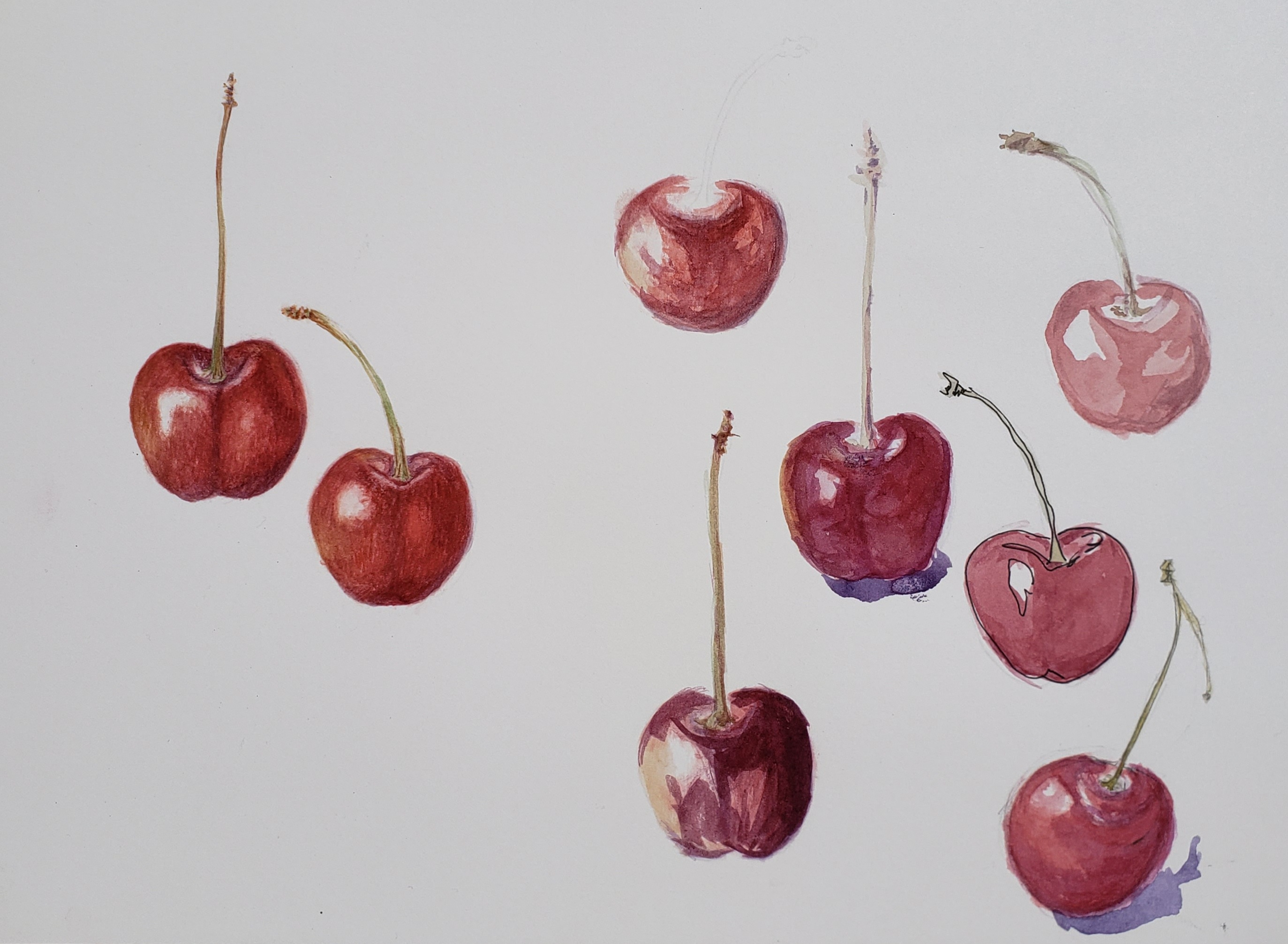 This week we are exploring the colors and technique of my recent class ‘Cherries in Dry Brush Watercolor’ by excellent artist and instructor Carrie Di Costanzo.