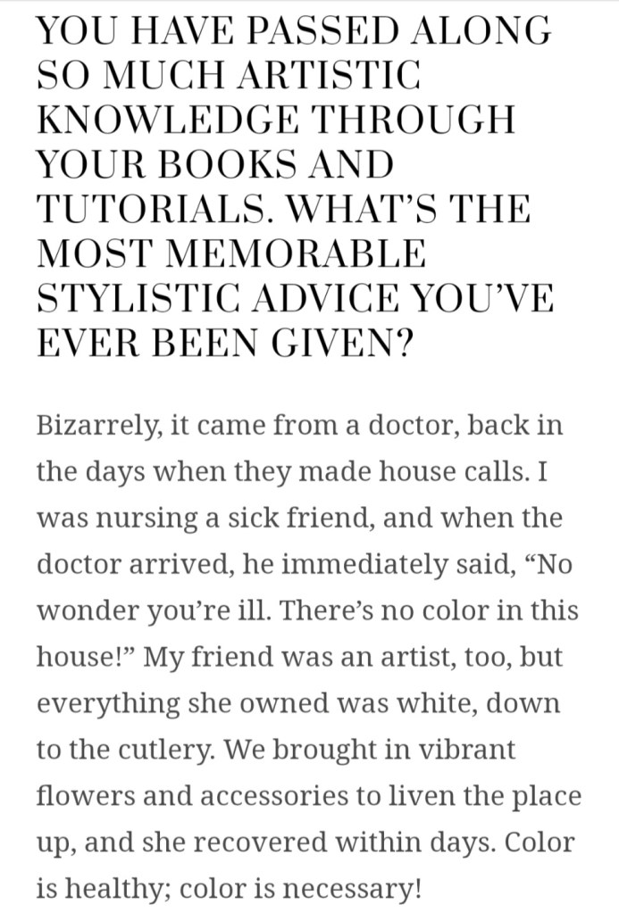This Q&A from an interview with Flower magazine is telling of Annie’s personality and such good advice… color is therapeutic.