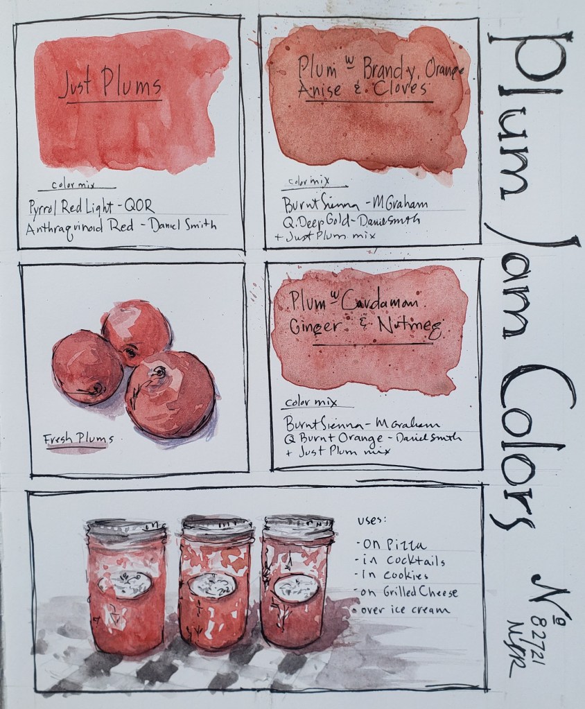 Color week 33 features the color mixes for ‘Plum Jam’. It is jam making season and here we have 3 jams with distinct colors along with distinct [and delicious] flavors. Mixing the colors included a base jam tone and building from that base, much like making the jam itself.
