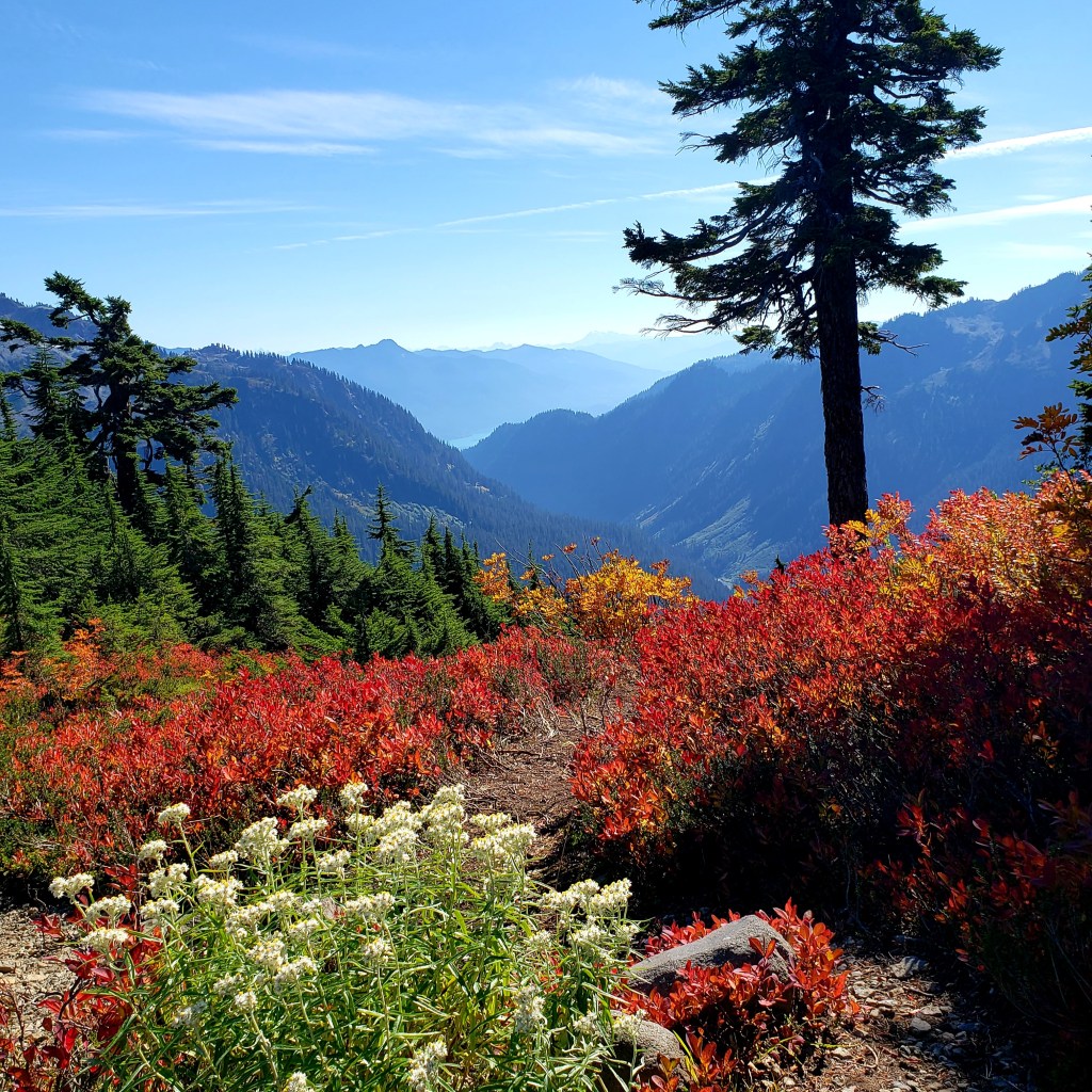 The ‘warm’ colors of fall foliage [ Yellow. Crimson. Orange] are cast against the complementary ‘cool’ blue of the sky and mountains. It’s the basic color wheel at work, the colors are opposite each other [Blue & Orange for example] . The atmospheric blues are especially blue in fall because the sun is lower in the sky and less humidity makes the air more clear.