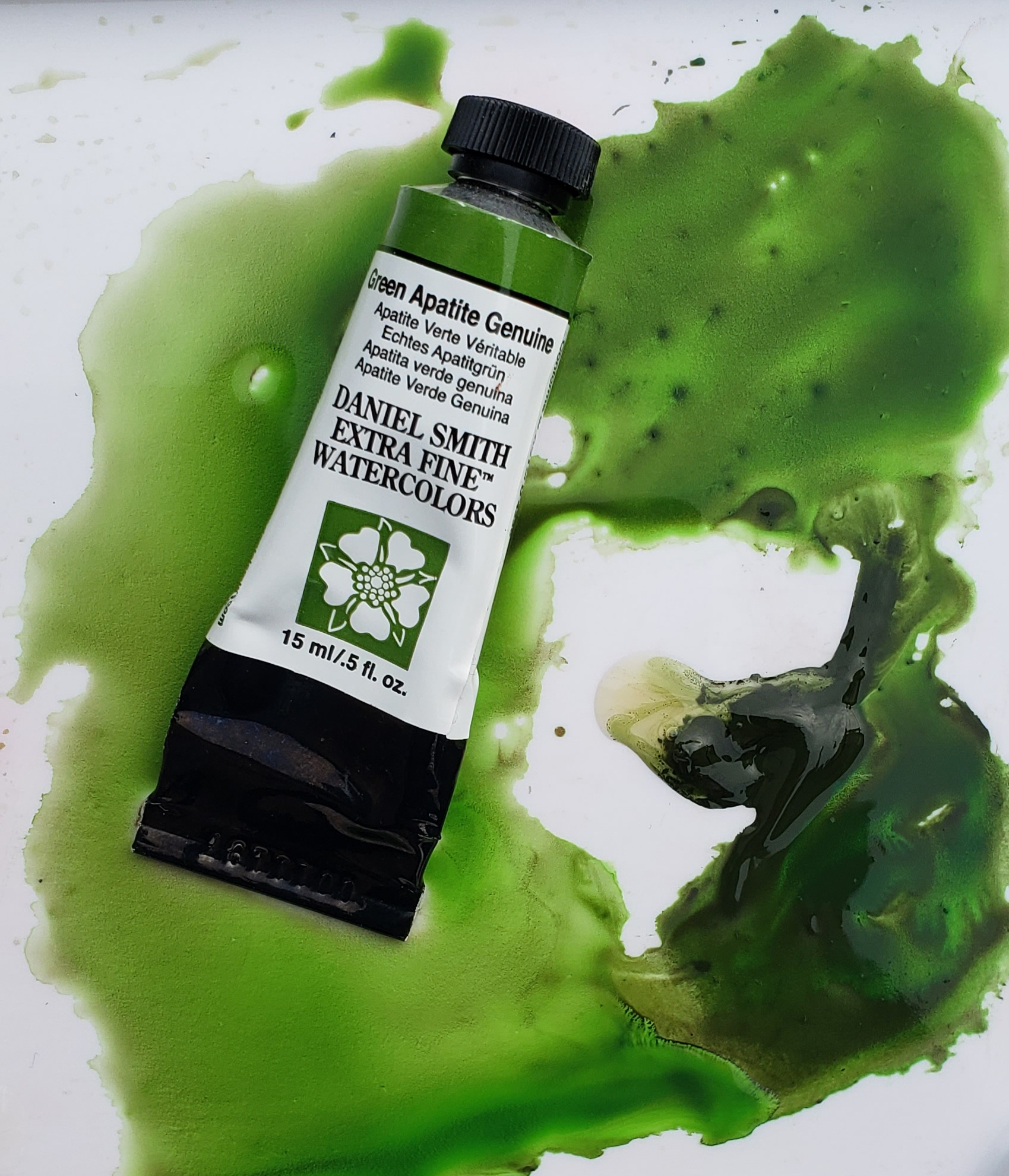 Color Week 40 explores Green Apatite Genuine. This is a fascinating sedimentary and granulating color that ranges from a fresh yellow-green to dark olive. My acquisition of the color was by accident – it was included in a boxed set that was on sale. I was getting started in watercolor and thought the colors looked like interesting additions to my palette. They were all highly granulating colors, and not understood or appreciated by someone starting in watercolor so they went to the back of the box… three years later I am beginning to use the colors with some appreciation.