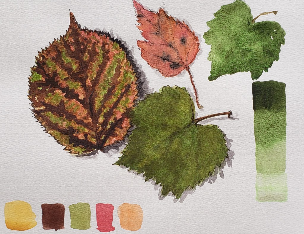 Before doing this research on Green Apatite Genuine I decided to use the green for a fall leaves sketch. Descovering the lovely range of the color sparked the interest in the color for this post. The granulation also reminded me of how lovely these colors can be, especially when using a rough cold press paper.