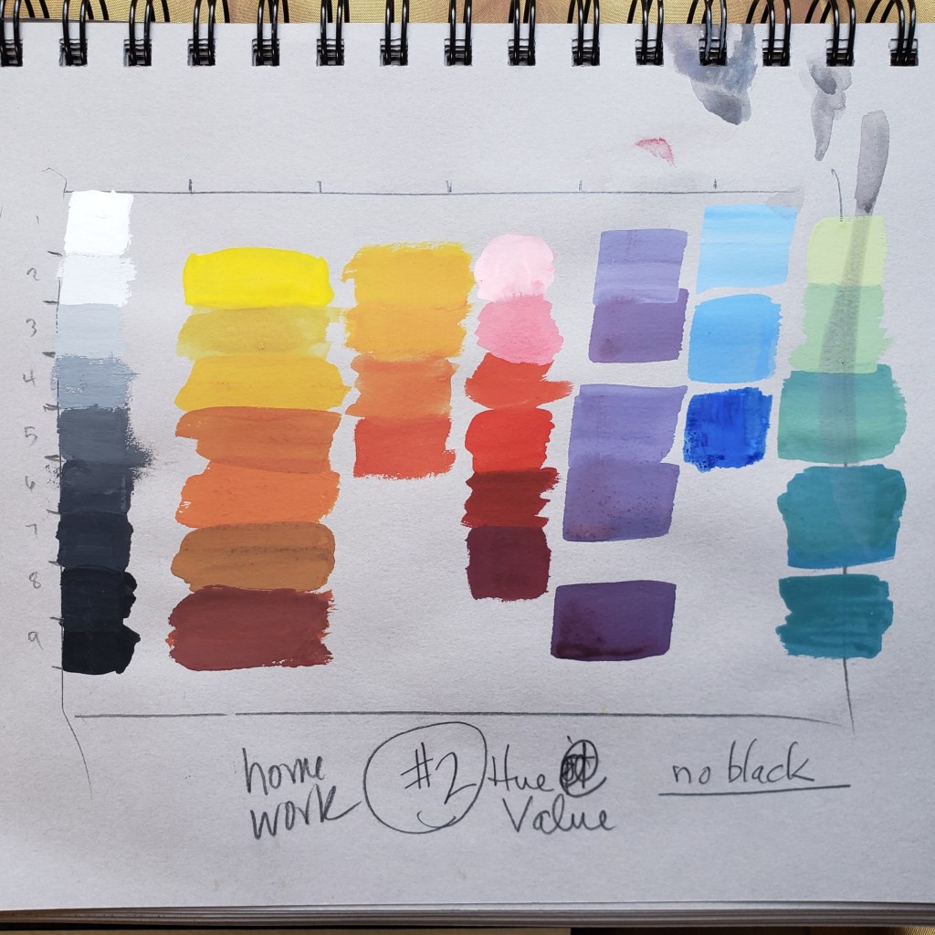As a note: my Fundamentals of Color class continues, this week working on Hue at the Value level. Many more scales and time needed to develop the skill to see the gradations within a hue. It all starts here.
