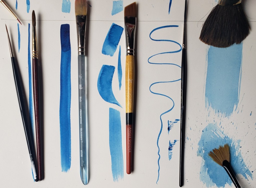 - Flat – these brushes end in a square, blunt edge. They come in different widths, 1/2″ shown. They’re good for washes.