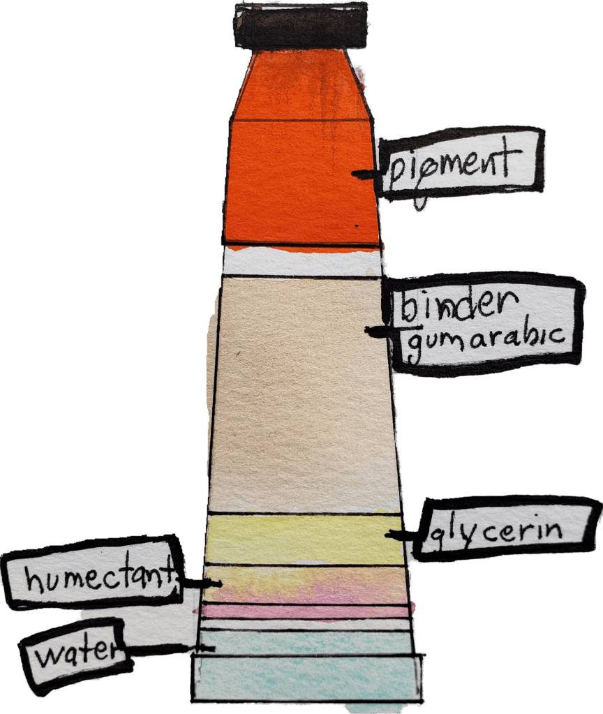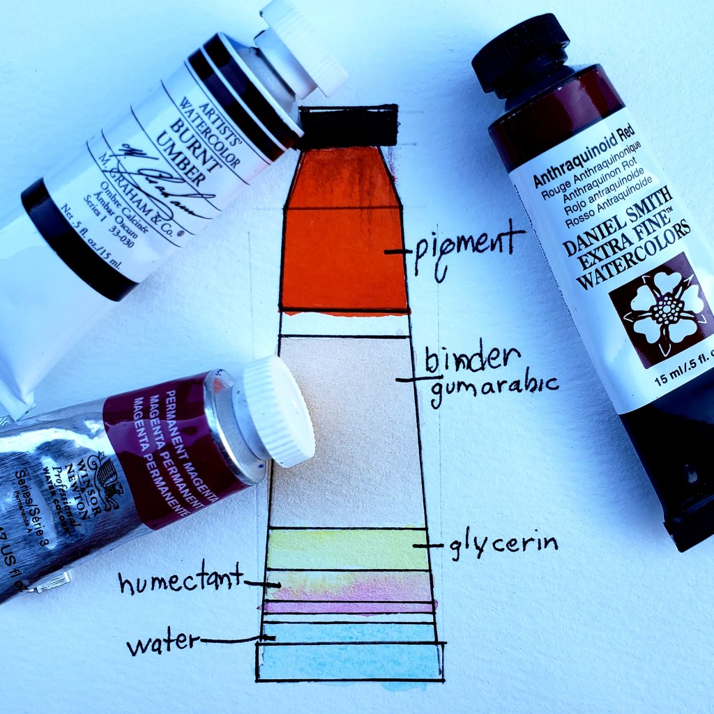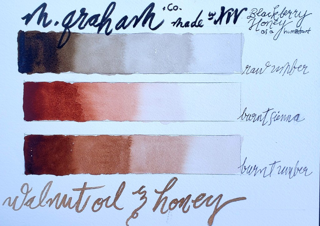 Humectant most used today is inexpensive corn syrup it helps paint to retain moisture. As I’ve noted M Graham uses honey as their humectant. The humectant is needed because both glycerin and gum arabic dry relatively quickly