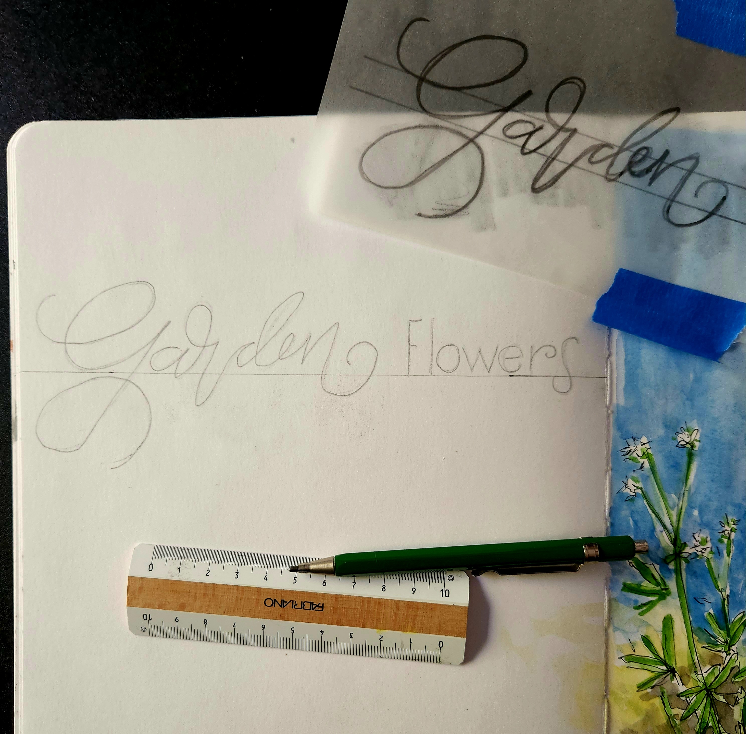 Here are a few examples of recent lettering in my sketchbooks – taking time to create pencil lines, planning the size using tracing paper, inking or painting the final letters and erasing the pencil lines.