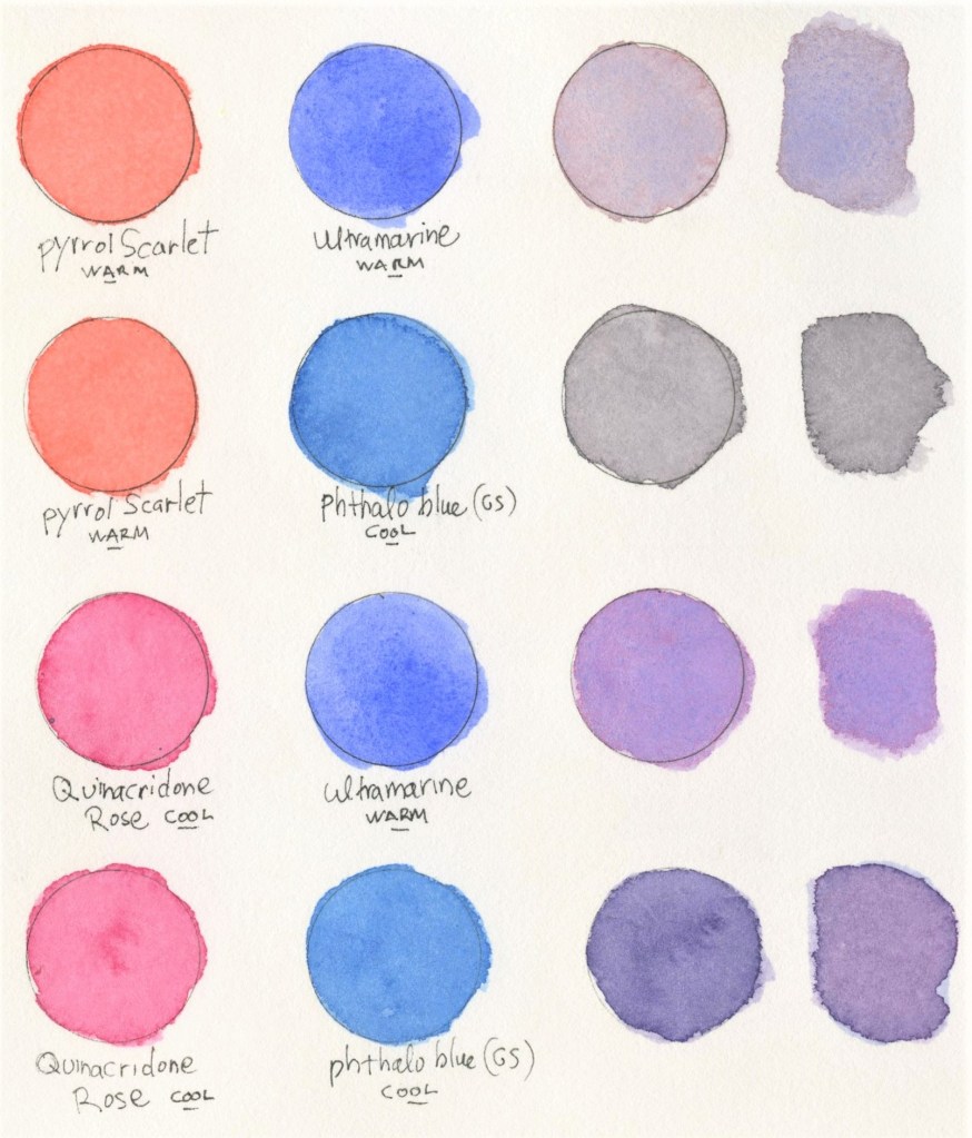 Typically, you will want a warm and a cool tone for a watercolor sketch. Try mixing a range of purples using the combos shown here. Purple can get murky quickly so make sure you are using warm and cool tones to achieve a saturated color.