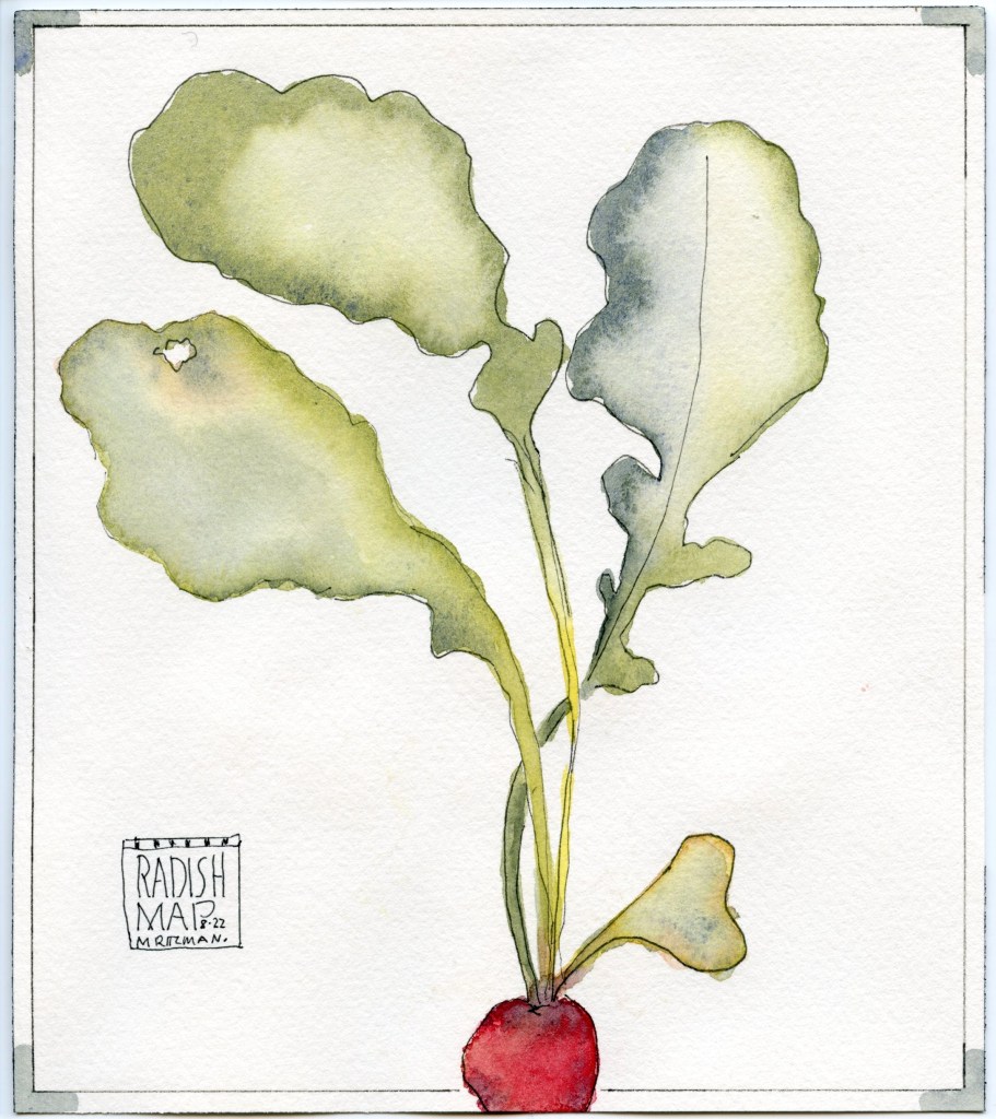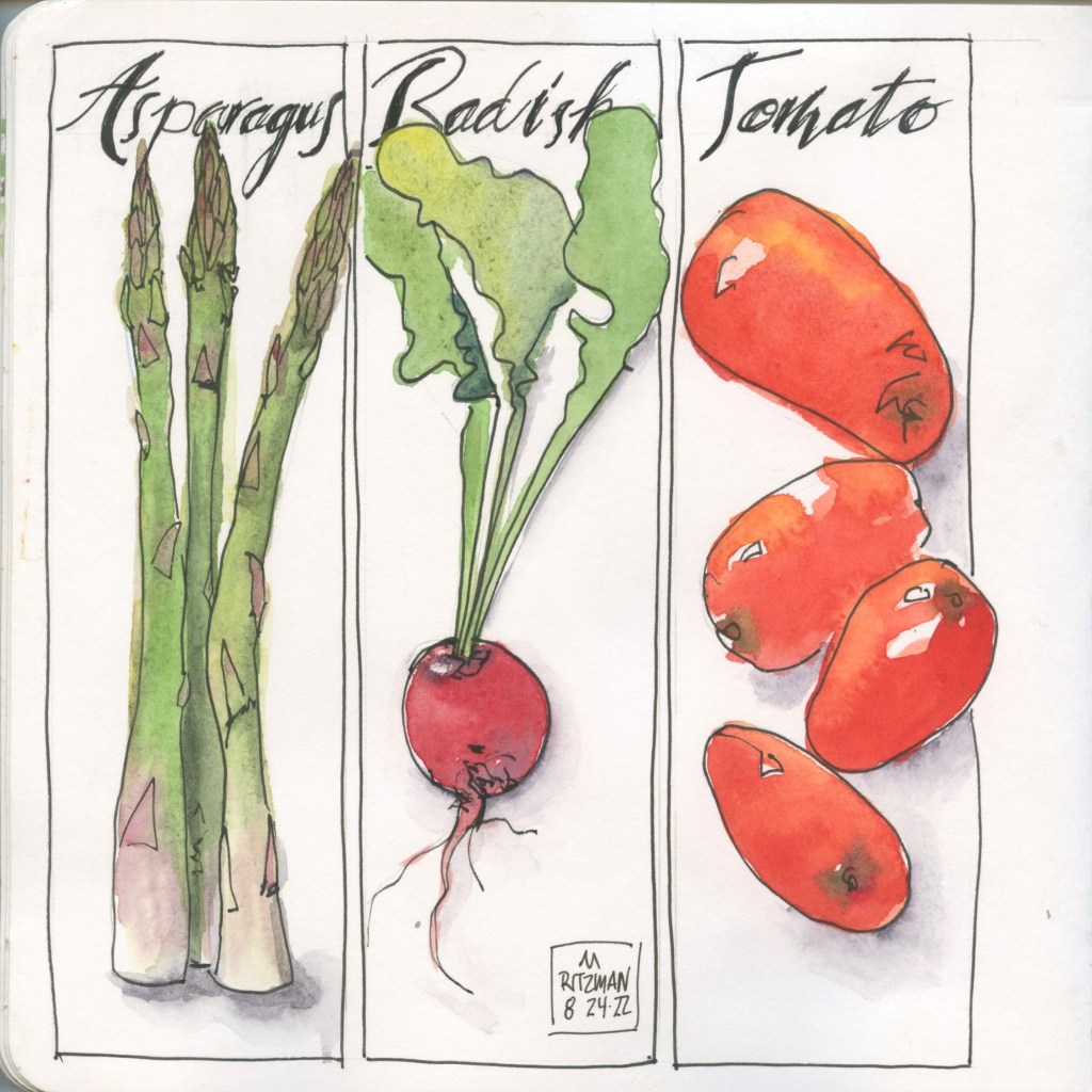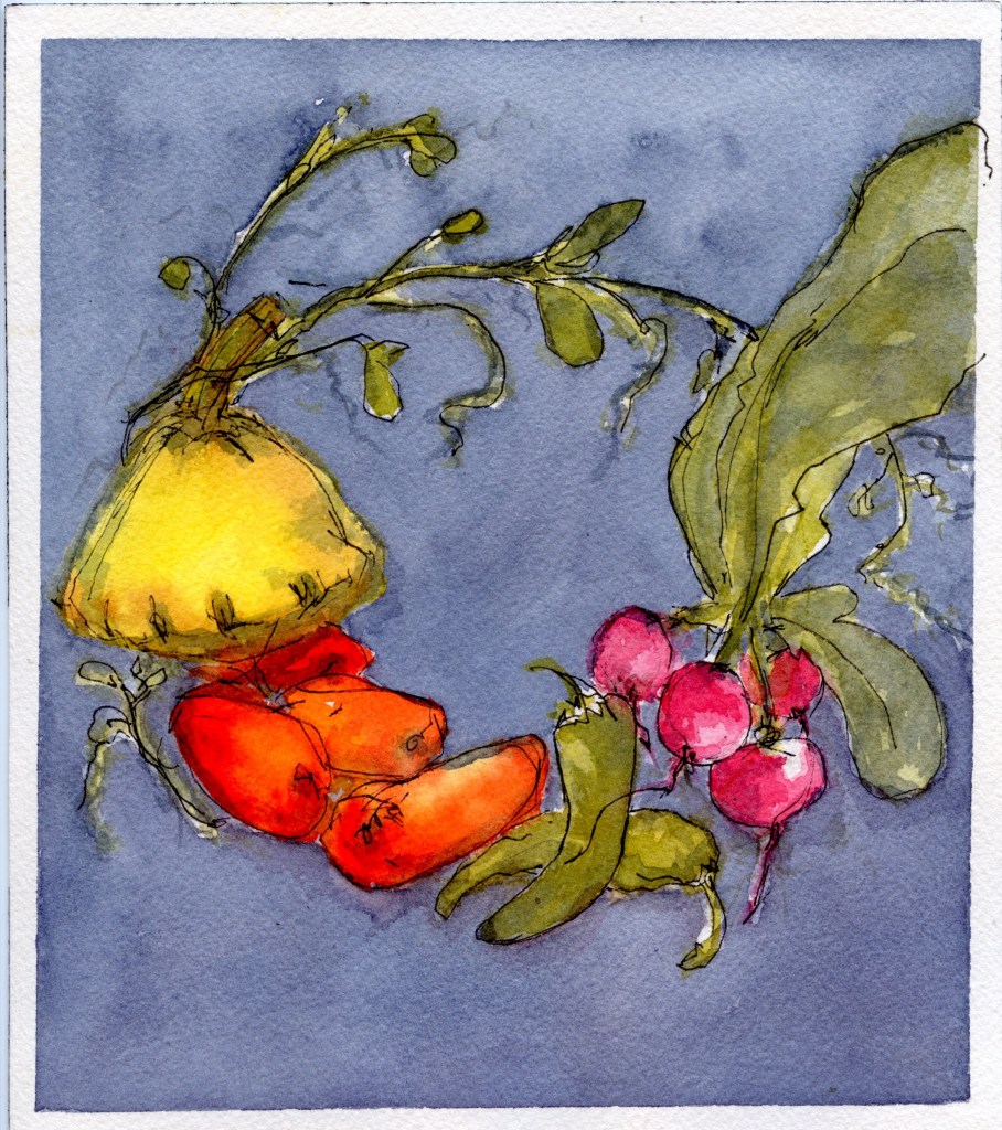 This week’s watercolor sketching subjects quickly became a healthy meal. Before becoming a meal, the vegetables were a great way to revisit basic color mixing and elementary, easily overlooked watercolor practices – Keep your water clean. Keep your colors clean. Keep your highlights. The veggie motivation came courtesy of a Jean Mackay class via Winslow Art online – check out her offerings on her site here.