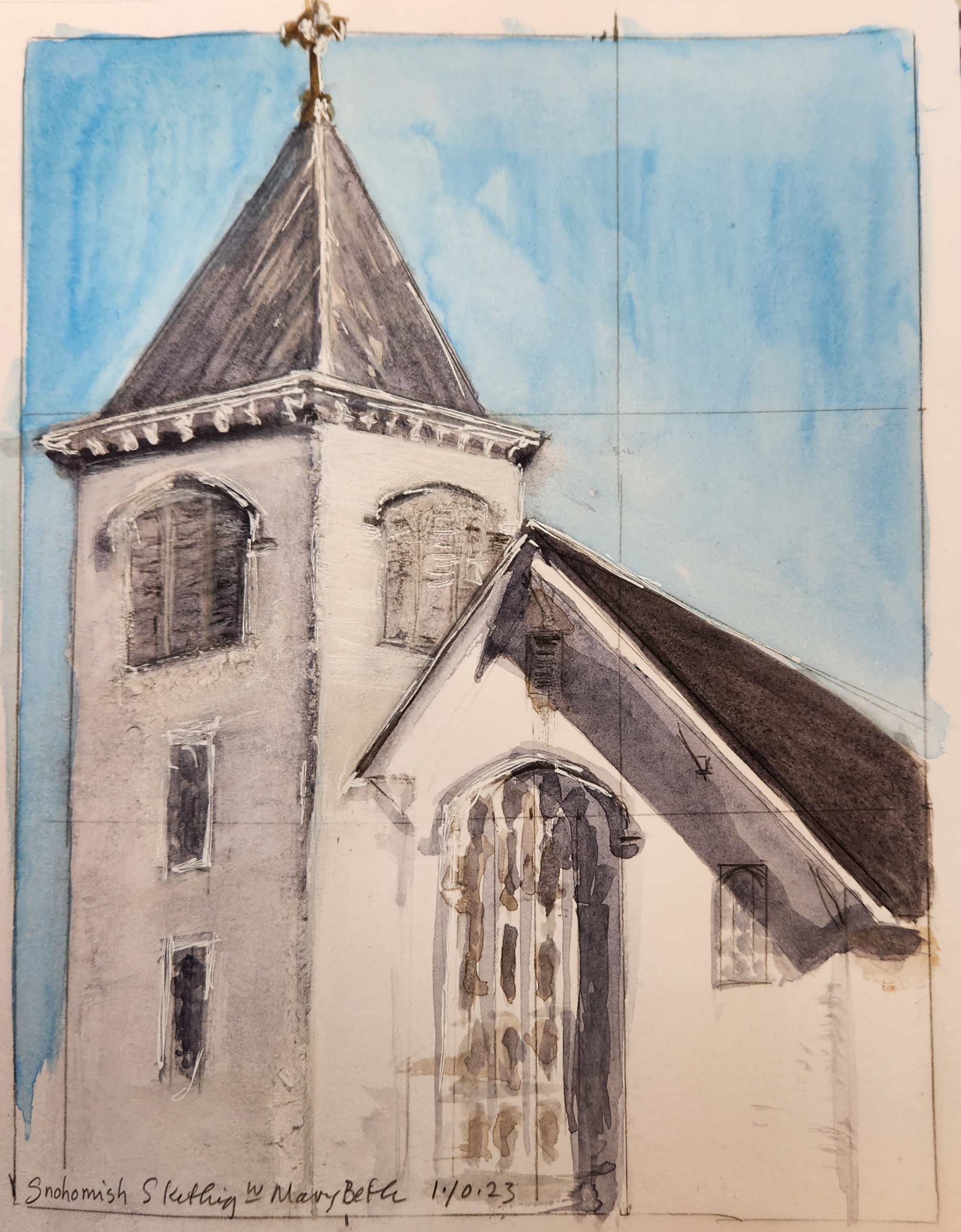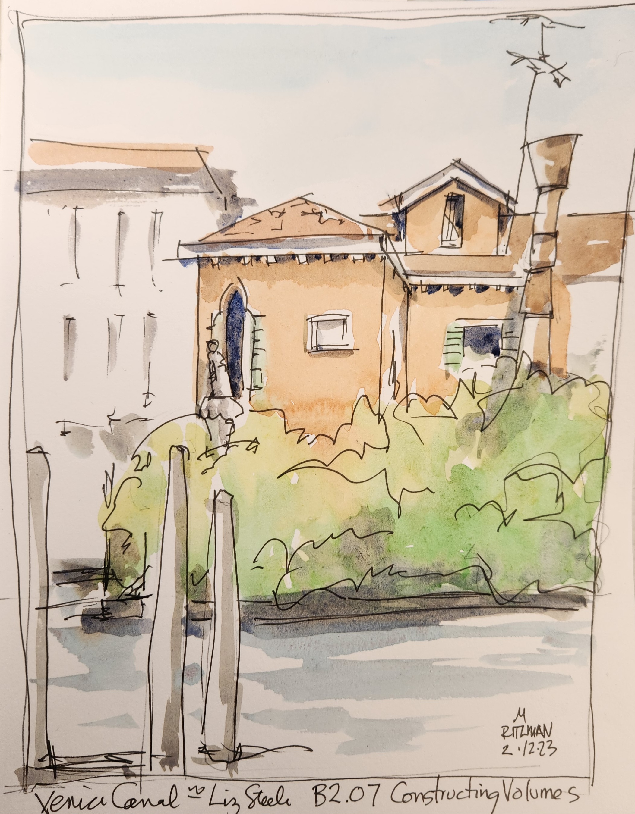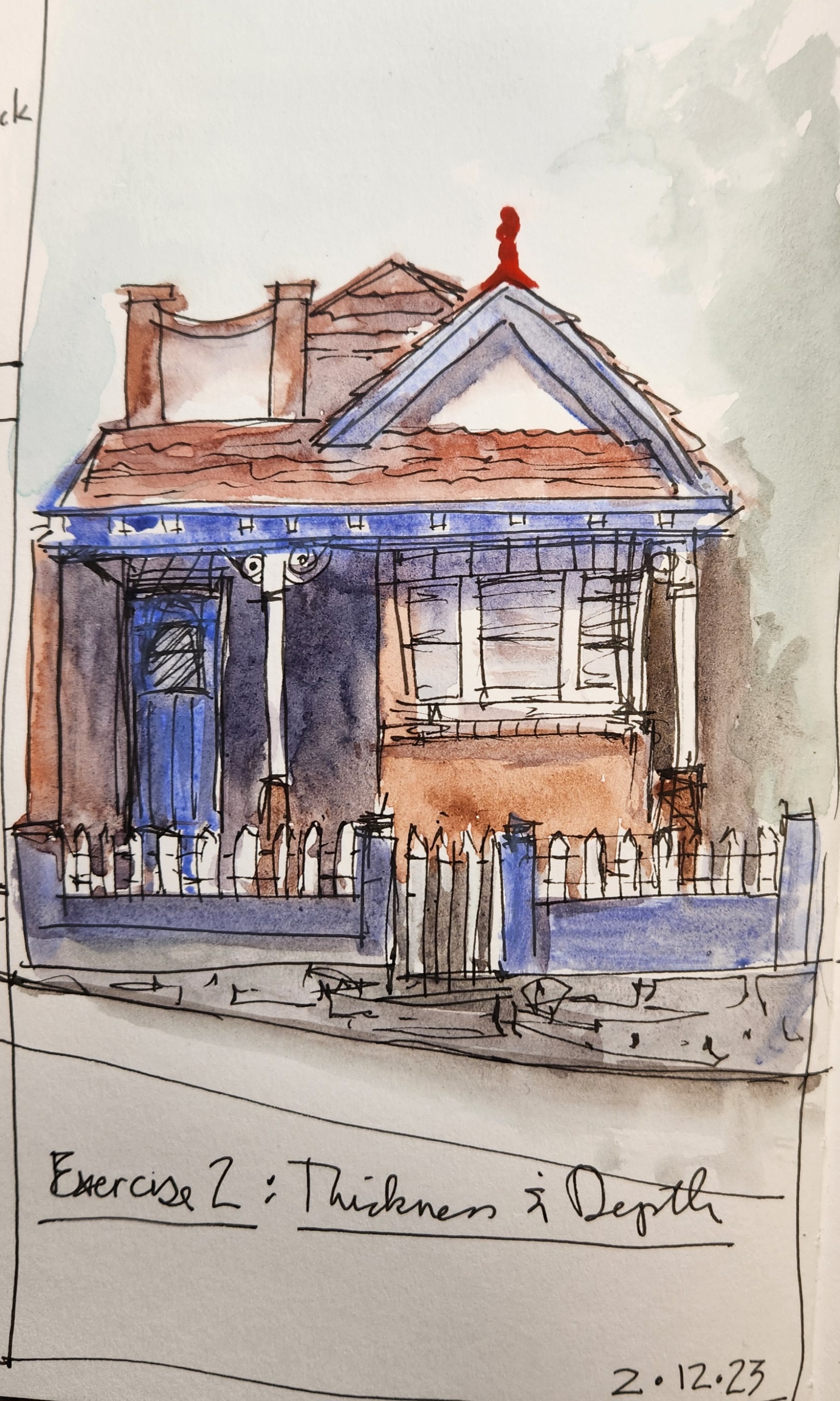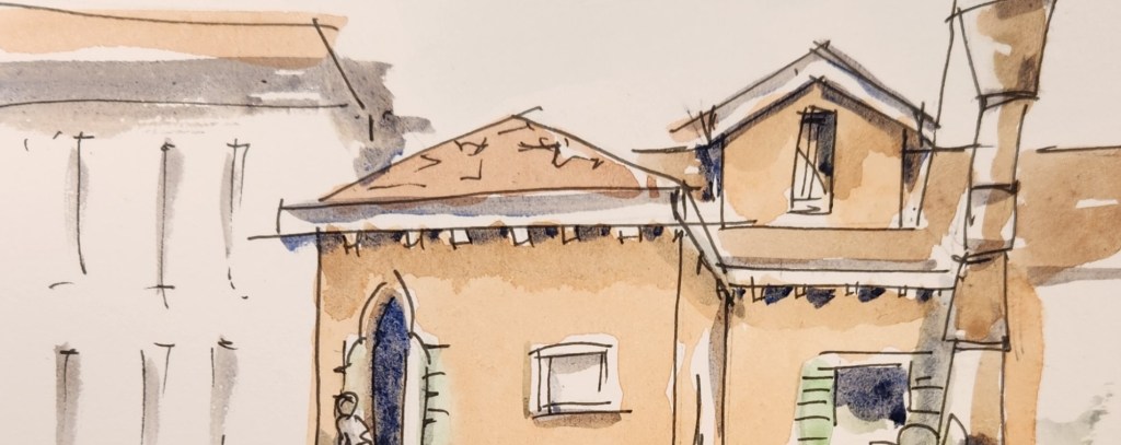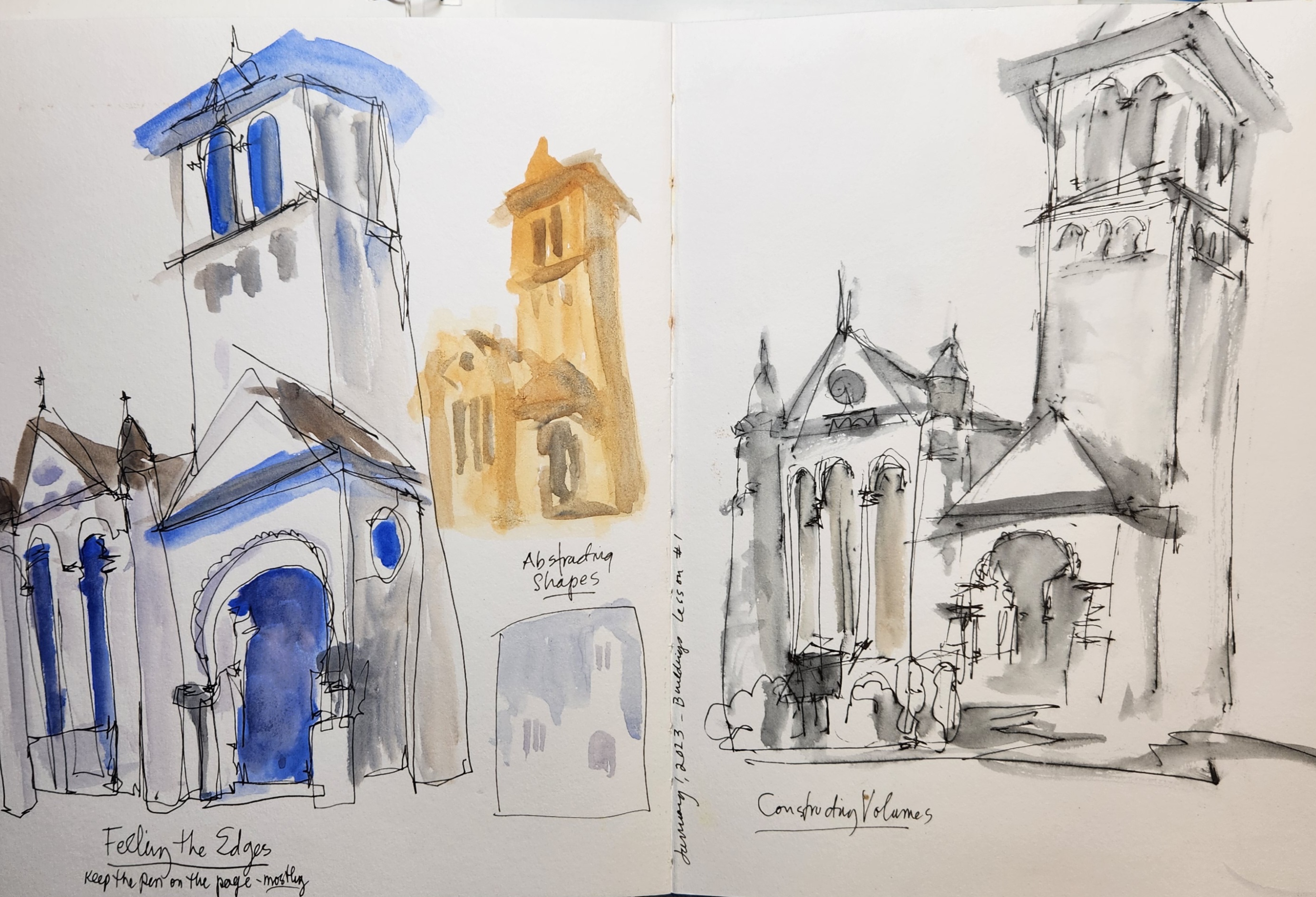 I am working through a self-directed series ‘Buildings’ with Liz Steel. Lots of fun exercises to study buildings. She starts with simply learning to look at shapes and edges – I have started with photos and moved to outdoor locations for the exercise sketches.