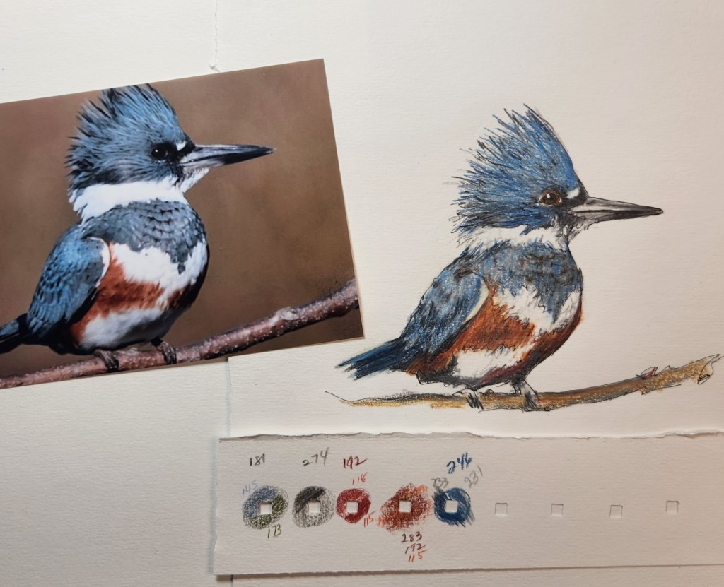 Layering is the technique that’s usually used at the beginning of a drawing, simply applying colors in layers to get the different values. This Kingfisher page shows color testing and layers. [This bird image is from a Cornell Lab Paint Along with Liz Clayton Fuller]