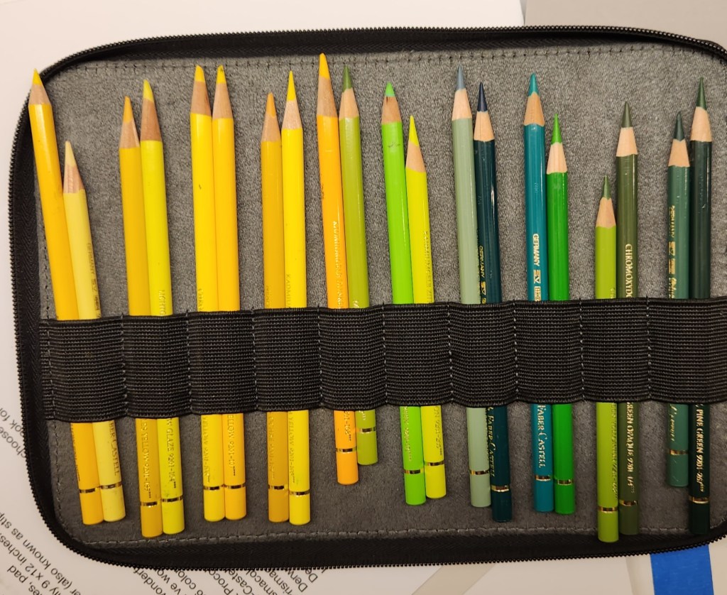 The art color pencil was invented in 1924 by Faber Castell and Caren d’Ache. It is known that the Greeks and the Romans used colored crayons based on wax … the art pencils of today are in pencil form made mainly from a formula of wax and oil and pigment. The various brands offer a variety of pencil formulas that achieve soft lines, hard lines and blending characteristics and each artist goes on to choose a variety of pencils to achieve a final work. My pencil choice is Faber Castell Polychromos with a few others thrown in.