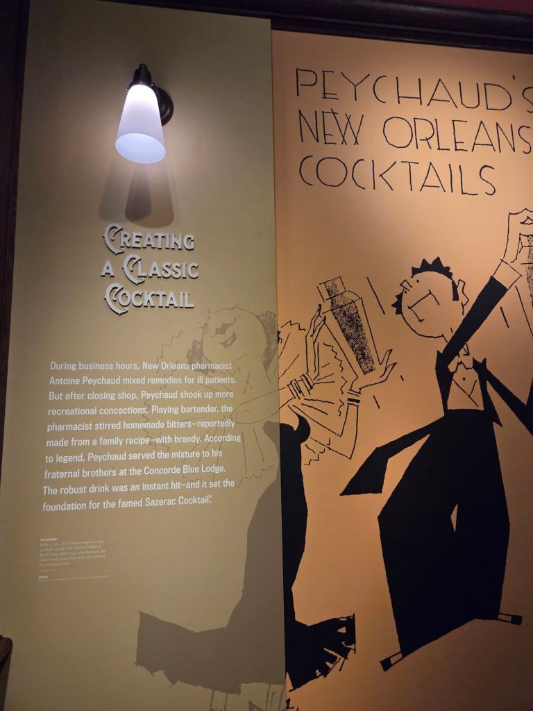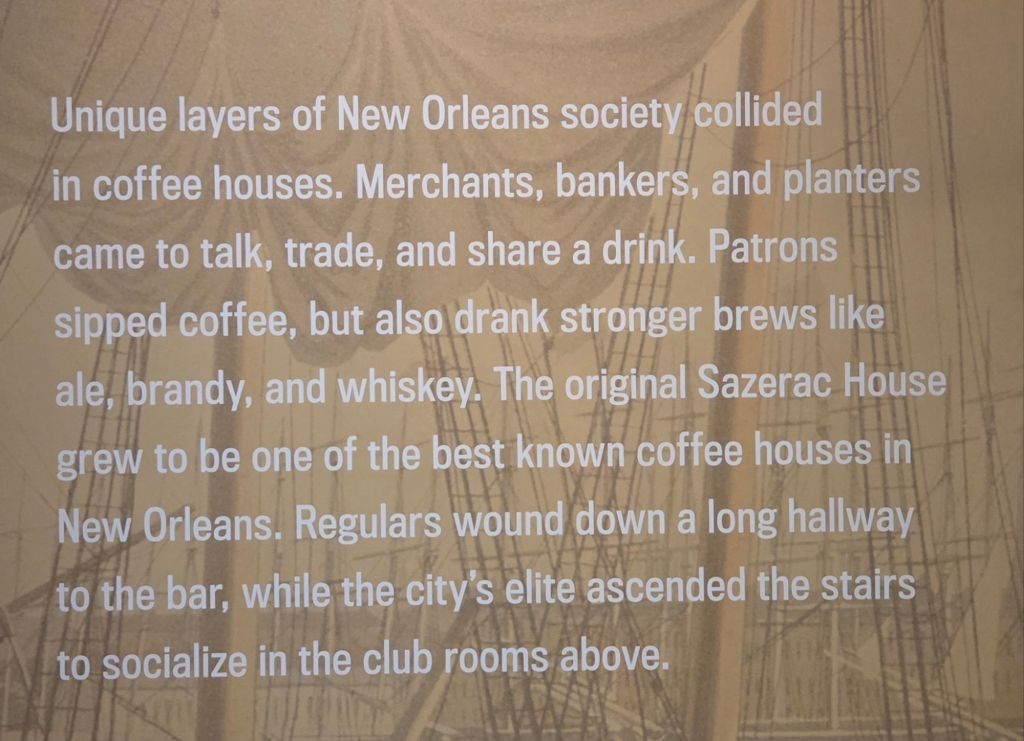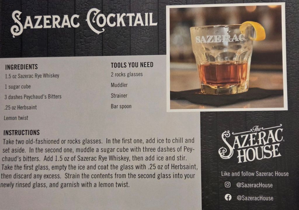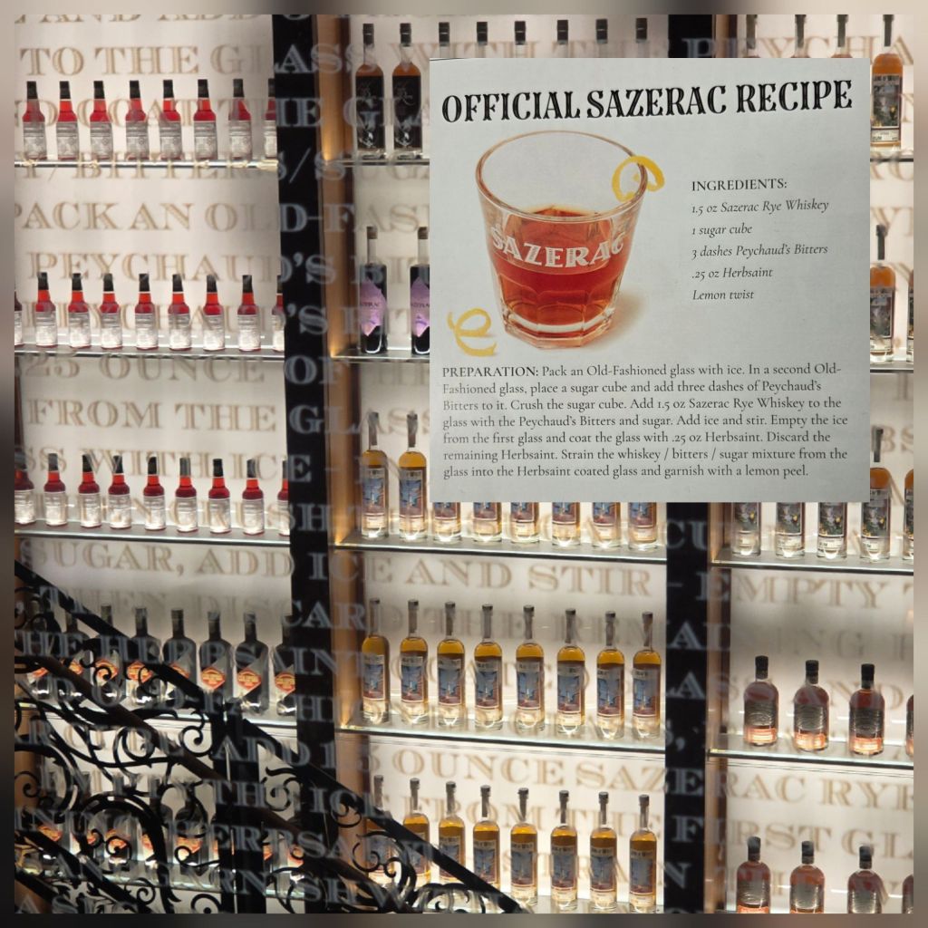 A SAZERAC is known as the cocktail of New Orleans… it’s a tangled history of coffee houses, medicinal bitters, an Absinthe replacement and Cognac replaced with Rye Whisky after the phylloxera edidemic. It was a very informative tour… and we sampled 3 cocktails!